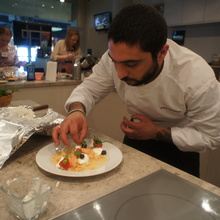 Средиземноморская кухня: салат с гребешками и спаржей, корейка ягненка, творожный крем с мандарином и шоколадом