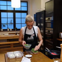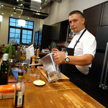 Фьюжн: крем-суп из спаржи, фрикасе из индейки, штрудель с клюквой