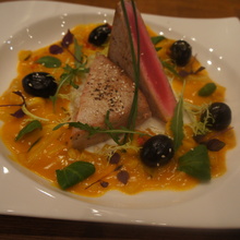 Франция: салат из кальмаров, молодой петушок тушеный в вине, томленая слива с мороженым