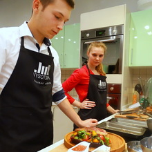 Фьюжн. Каре ягненка, салат с голубым сыром, клафути с вишней