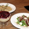 Фьюжн. Каре ягненка, салат с голубым сыром, клафути с вишней